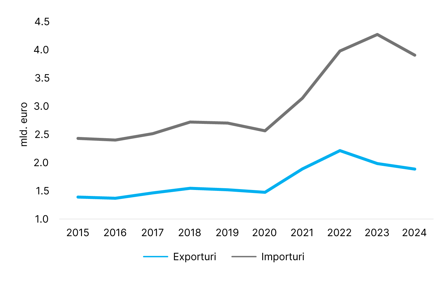 Over the past ten years, Romania has had a negative trade balance with Austria, importing on average €1.4 billion more per year than it exported.